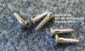 Pickguard Screws. Set of five (5). Nickel plated steel. #4 1/2" partial thread slot head screws. Used to mount pickguard on blackguard Tele's.